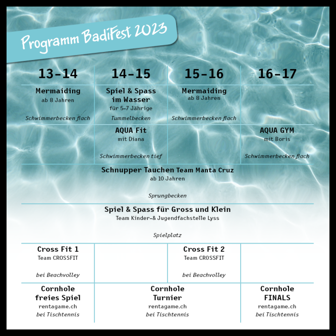 Am Samstag, 12. August 2023 findet das diesjährige BadiFest statt. Es warten einige Workshops und Attraktivitäten auf Gross und Klein. Weitere Informatioen finden Sie hier: BadiFest