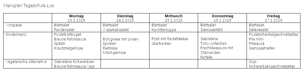 Menüplan Tagesschule vom 09.02. bis 13.02.2026